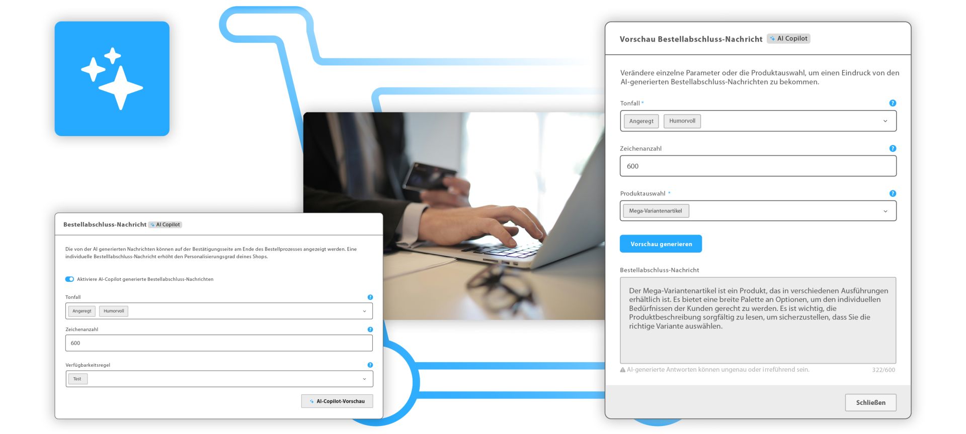 Diese Funktion erzeugt automatisierte, AI-generierte Nachrichten auf der Bestellbestätigungsseite am Ende des Kaufprozesses. Diese Nachrichten werden auf Basis verschiedener Einstellungen und der Produkte im Warenkorb erstellt.