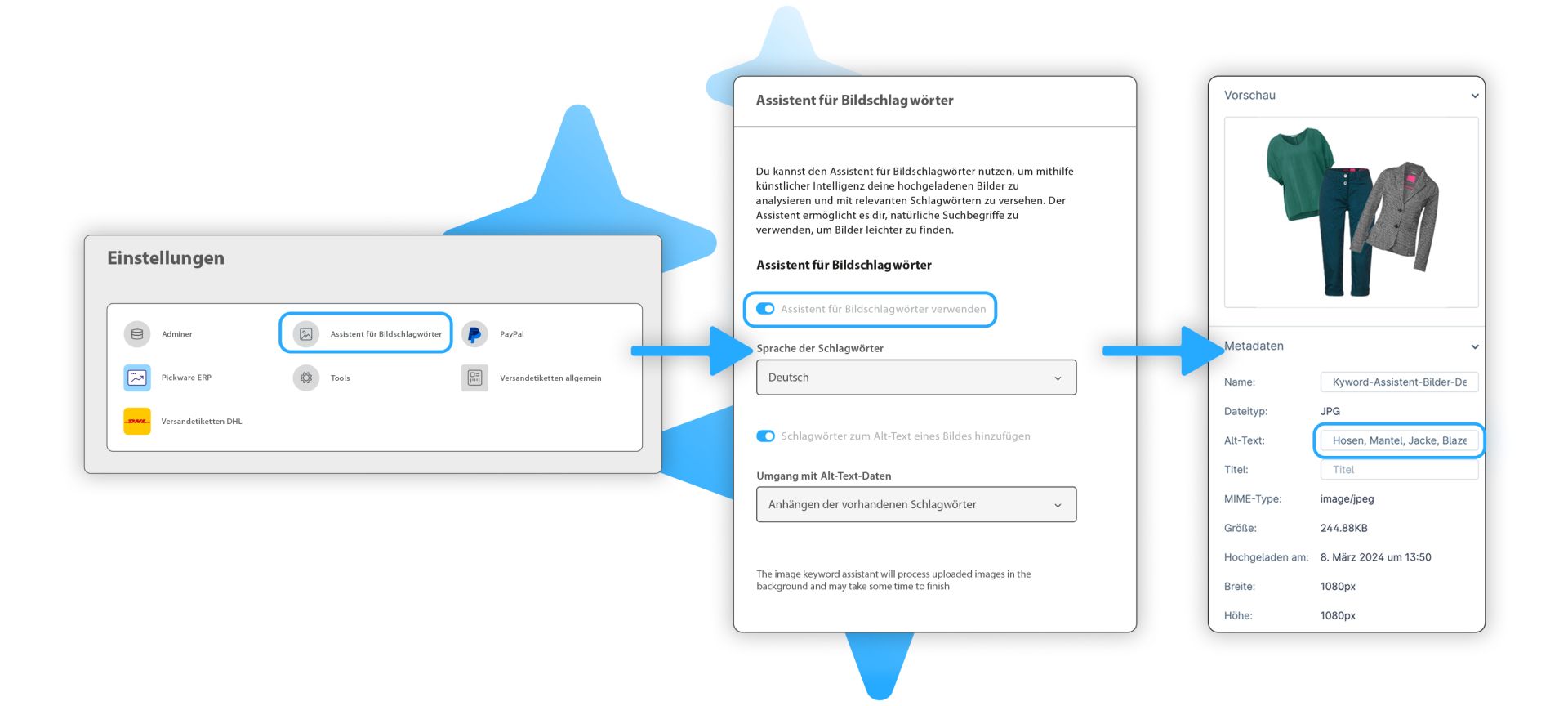 Der Assistent für Bildschlagwörter bietet eine einfache Möglichkeit zur Optimierung von Bildern im Shop. Durch das Aktivieren des Features in den Admin-Einstellungen und die Konfiguration der Sprache für die Schlagwörter können Bilder automatisch mit relevanten Tags versehen werden.