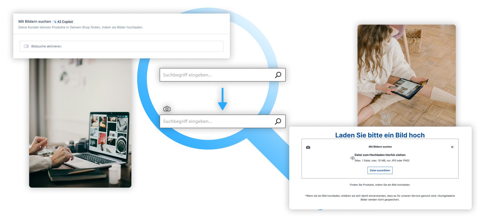 Die Bildersuche ermöglicht es Kunden, Produkte anhand von Bildern zu finden. Nach der Aktivierung in den Einstellungen der Storefront-Suche ist die Funktion im Frontend verfügbar.