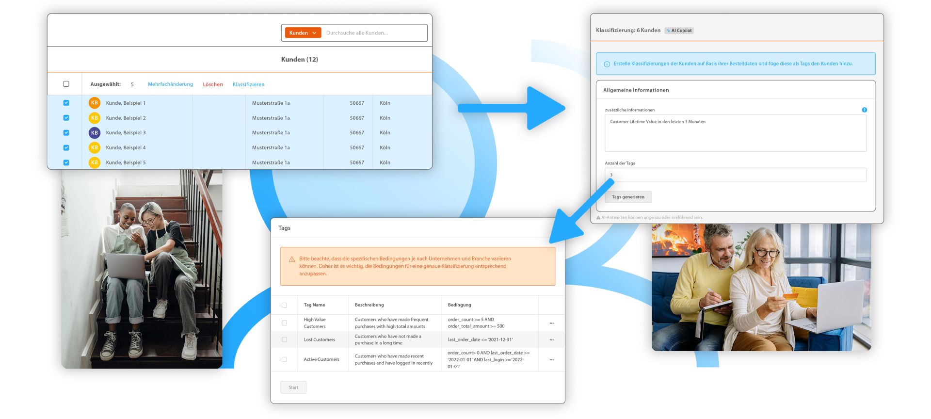 Um diese Funktion zu verwenden, wählt man zunächst in der Kundenübersicht alle relevanten Kunden aus und startet dann die Klassifizierung. Dabei können optional zusätzliche Informationen angegeben werden, die für die Klassifizierung wichtig sind. Nach dem Generieren der Tags können diese noch manuell angepasst und anschließend den entsprechenden Kunden zugewiesen werden.