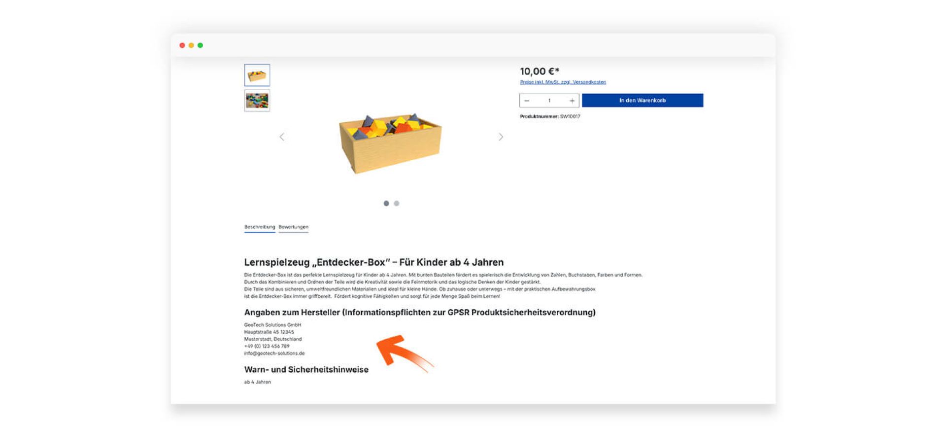 Mit der neuen Produktsicherheitsverordnung gelten für Händler verschärfte Informationspflichten. So sind relevante Informationen direkt im Angebot zu platzieren und dürfen nicht einfach nur verlinkt werden. Zu diesen Informationen zählen beispielsweise eingetragener Handelsname sowie Postanschrift und E-Mail-Adresse des Herstellers. Hat der Hersteller keine Niederlassung in der EU, sind Name, Anschrift und E-Mail-Adresse der verantwortlichen Person zu nennen. Eine weitere Anforderung betrifft Warnhinweise oder Sicherheitsinformationen. Diese müssen leicht verständlich und in der Landessprache verfasst sein, in dem das Produkt verkauft wird. Darüber hinaus wird die Abbildung des Produkts verpflichtend. Hier reicht in den meisten Fällen ein Foto aus.