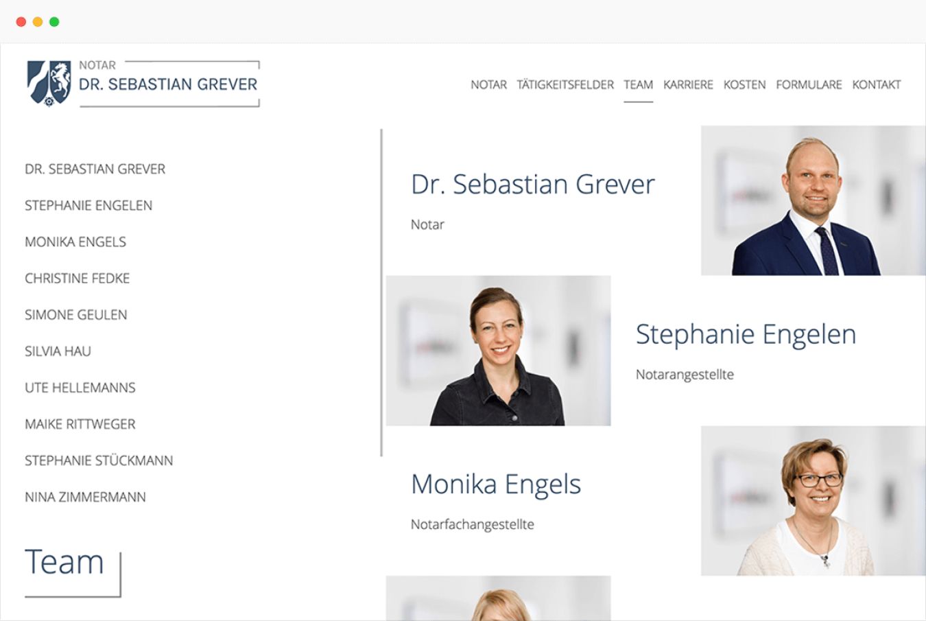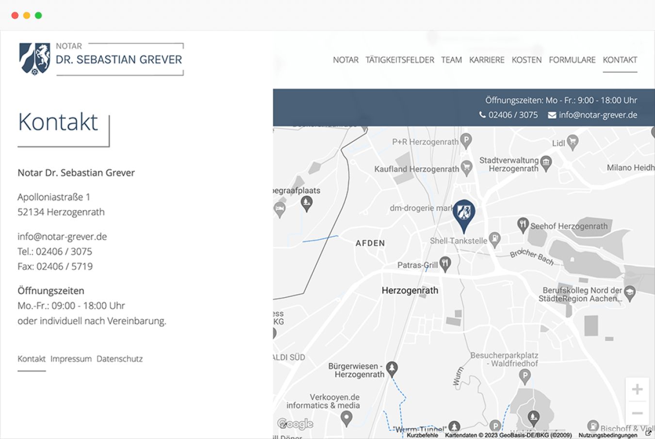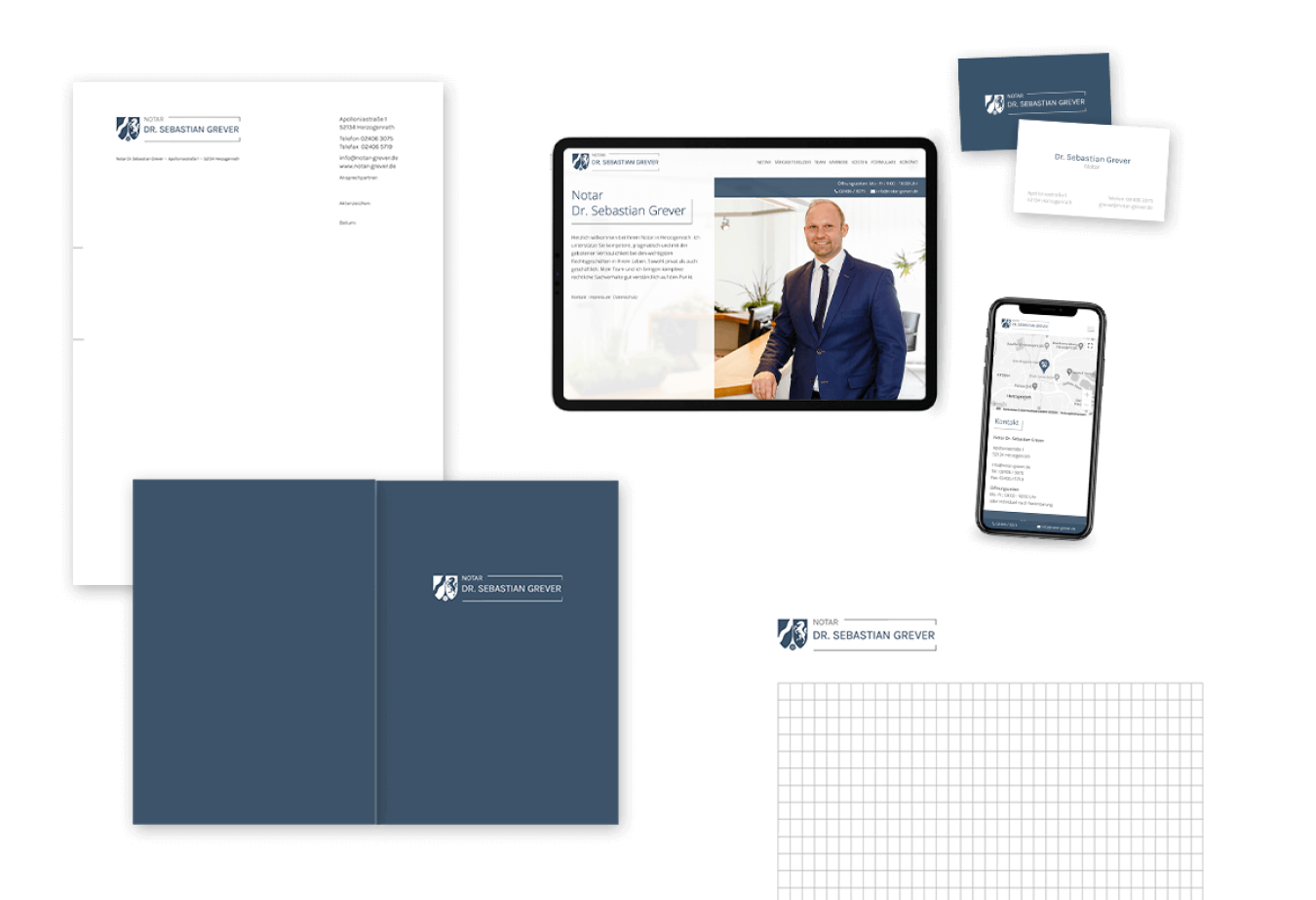 Wir haben für ihn das komplette Corporate Design entwickelt. Es umfasst das Logo ebenso wie die Visitenkarten, Briefbögen und Urkundenmappen. Der Internetauftritt stammt ebenfalls komplett aus unserer Hand, inkl. Textredaktion.