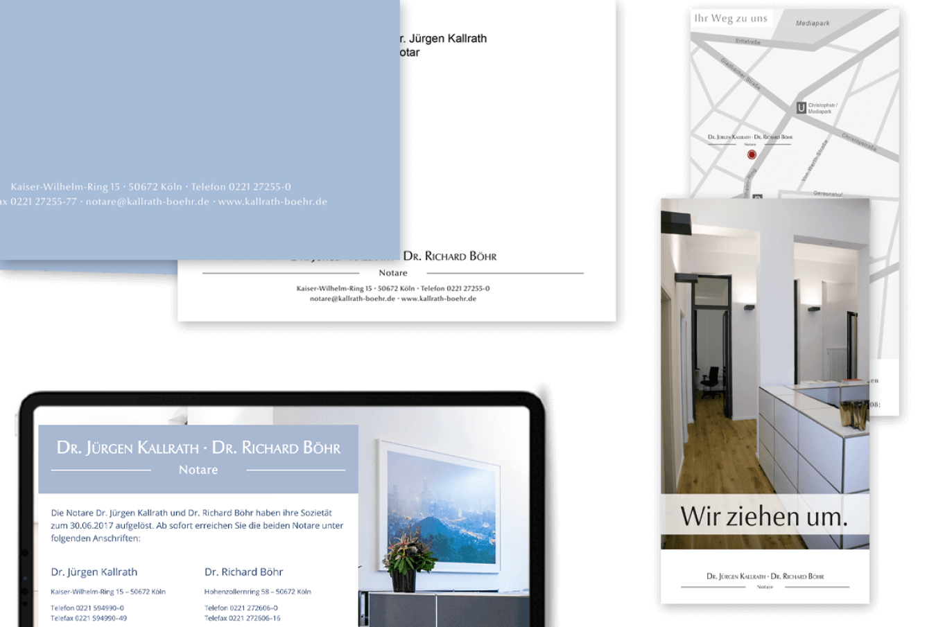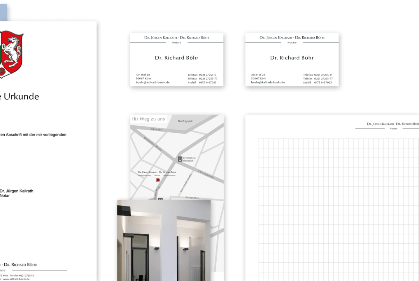 Wir haben für die Kölner Kanzlei das Corporate Design für die gesamte Geschäftsausstattung entworfen. Hierzu gehörten auch Flyer und Einladungskarten, aufwändige Urkundenmappen und Prospekthüllen. Den Internetauftritt haben wir ebenso gestaltet und programmiert.