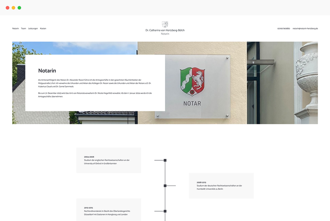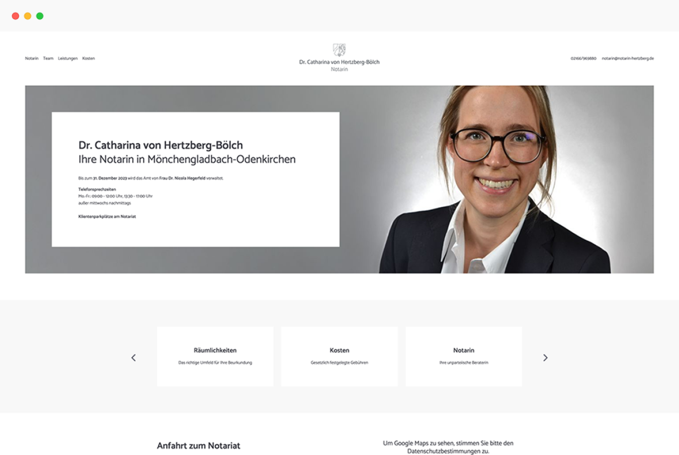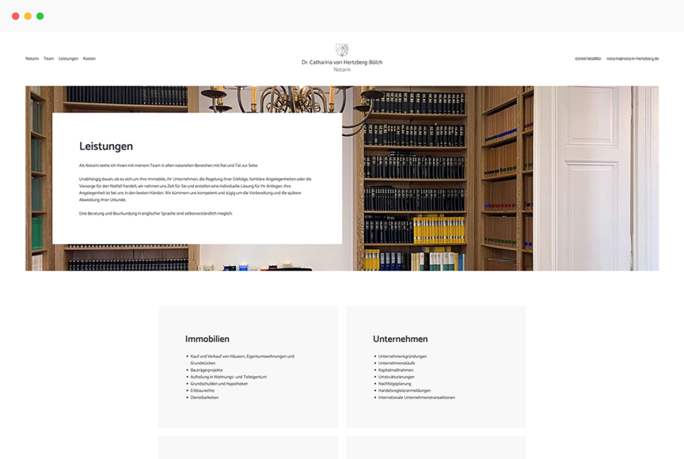 Wir haben für die Notarin Dr. Catharina von Hertzberg-Bölch das komplette Corporate Design entwickelt. Dazu zählt das Logo ebenso wie die Visitenkarten, Briefbögen und Urkundenmappen. Den Internetauftritt haben wir ebenfalls umgesetzt. Er wurde im Content Management System webEdition entwickelt und kann somit eigenständig gepflegt werden.