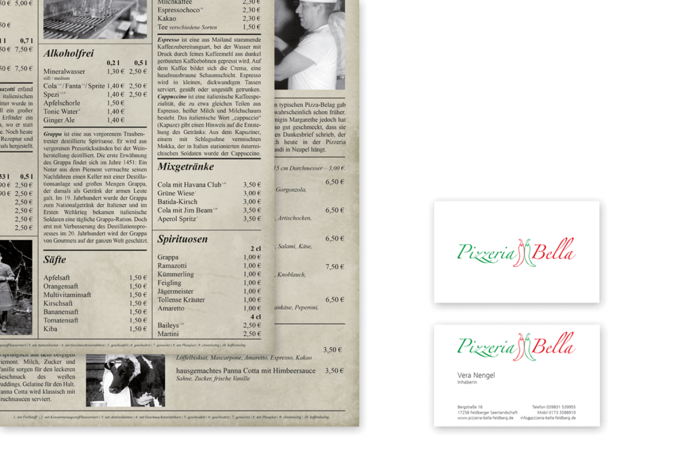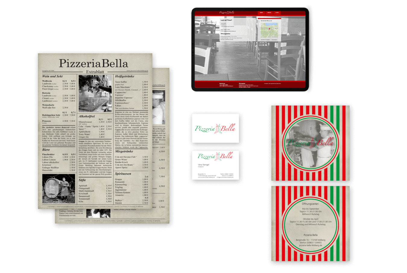 Wir haben für das Lokal das Corporate Design für die gesamte Geschäftsausstattung im Retro-Stil entworfen. Ein ins Auge fallendes Firmenschild und andere Werbemittel, wie Flyer und Einladungskarten, Poster und Aufsteller, gehörten ebenso dazu wie die originellen Speisekarten auf Hart-PVC. Auch den Internetauftritt haben wir gestaltet und programmiert.