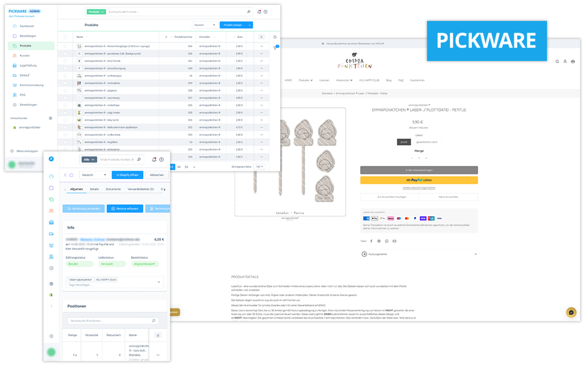 Da der Onlineshop sowohl digitale als auch physische Produkte anbietet, haben wir Pickware ERP über die Pickware Shopify App integriert. Die vollautomatische Warenwirtschaft kommt beim Versand und der Lagerverwaltung zum Einsatz, über sie läuft die Rechnungserstellung und eine DATEV-Anbindung.