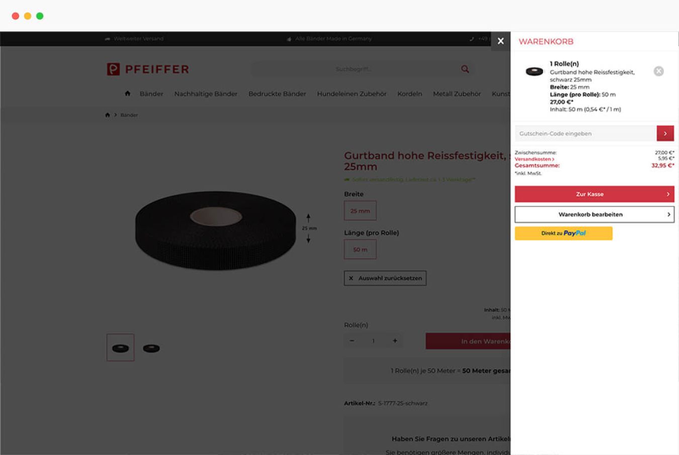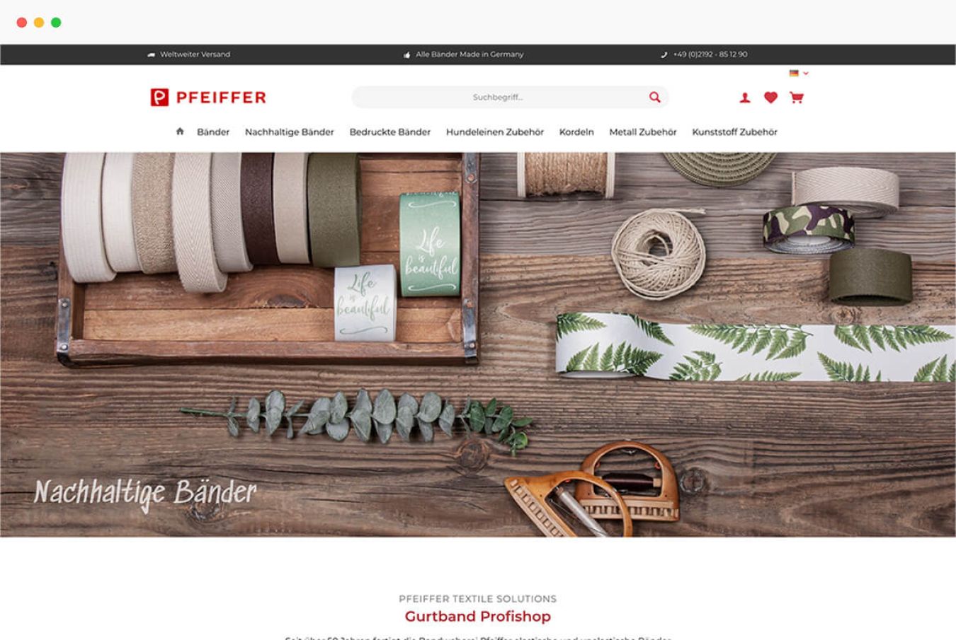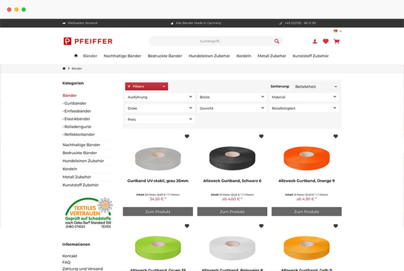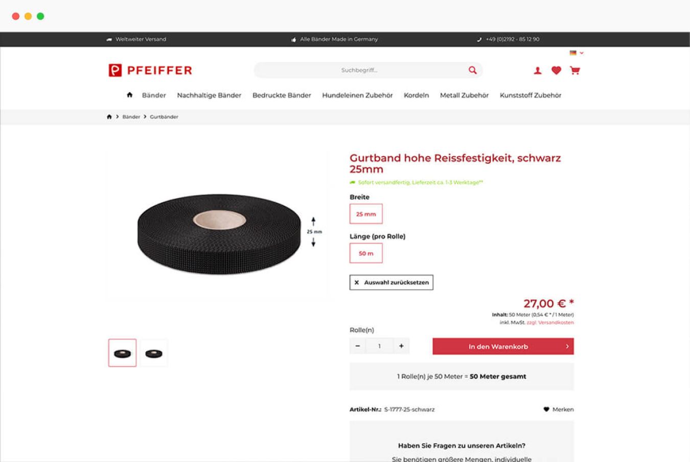 Beim Relaunch haben wir zwei separate Shops, die beide auf OXID basierten, zusammengeführt. Plattform für die neue Onlinepräsenz ist Shopware 5. Das Costum Products Plug-in ermöglicht es der Pfeiffer GmbH in dem neuen Shop erstmals Bänder mit Logo und individuellem Design anzubieten.