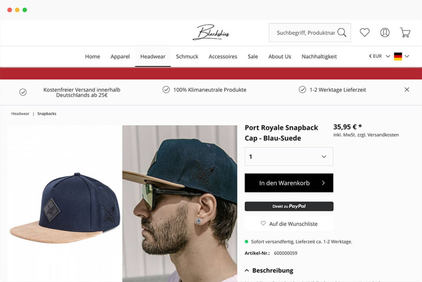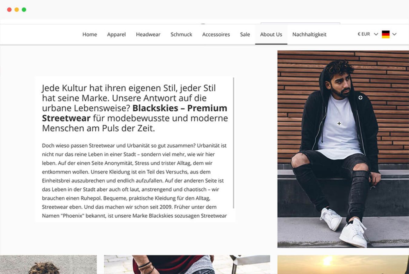 Wir haben Blackskies auf Basis von Shopware 5 zweisprachig eingerichtet, da Blackskies in den internationalen Märkten – vor allem dem US-amerikanischen Markt auftritt. Die Verkäufe erfolgen daher in diversen Währungen. Durch die Shopware Subshop-Funktionen profitieren beide Shops von gemeinsamen Ressourcen.