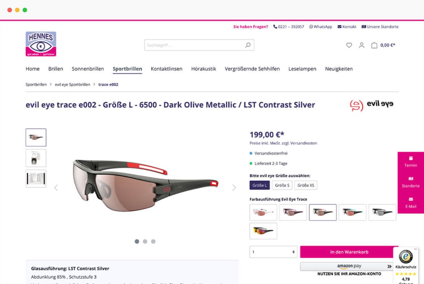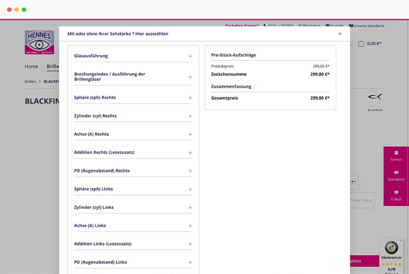 Wir haben die E-Commerce-Software auf Shopware 5 umgezogen. Bei dem Systemwechsel konzipierten wir u.a. die Produktdetailseiten neu. Dafür passten wir das Premium Plugin Shopware Custom Products speziell auf das Produkt Brille an. Der Kunde kann sich jetzt online seine Wunschbrille zusammenstellen, indem er per Mausklick Brillenmodell, Sehstärke, Gläserausführung etc. bestimmt. Dabei bekommt er je nach Auswahl den individuellen Preis angezeigt.