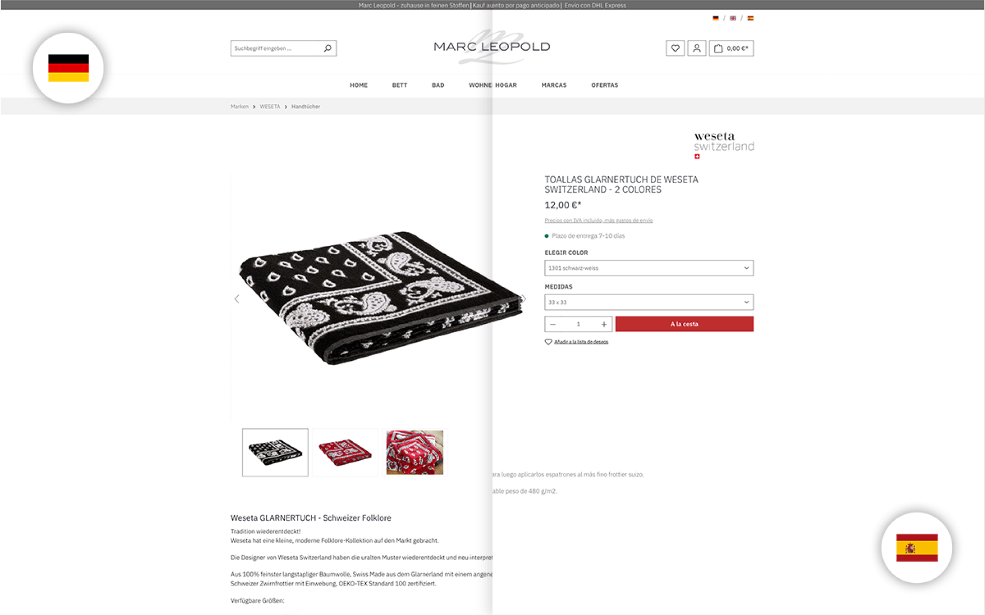 Zur Komplexität des Onlineshops trägt ebenfalls die Mehrsprachigkeit bei. Die Artikel werden in drei Sprachen präsentiert. Bei der spanischen Variante unterscheidet sich auch das Angebot, es ist speziell auf das Land zugeschnitten. Wir haben diese Vielfalt im neuen Shop abgebildet.