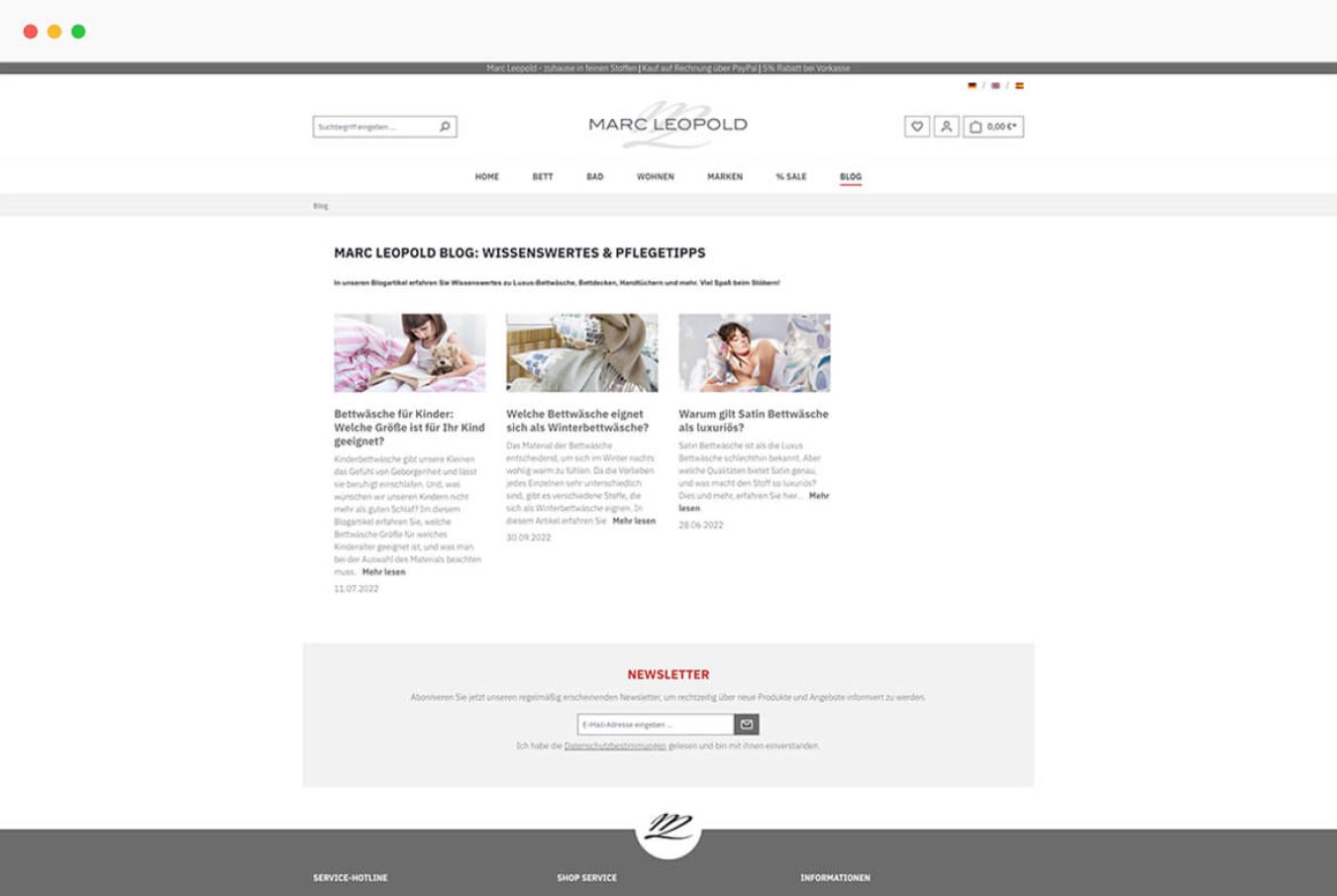 Bei der Migration war zudem die Blog-Funktion von besonderer Bedeutung. Aufgrund des guten SEO-Rankings und hoher Aufrufzahlen sollte der Blog im Shopware 6 Shop übernommen werden. Diese Funktion ist jedoch in Shopware 6 nicht enthalten. Wir haben daher ein Blog-Plug-in entwickelt, mit dessen Hilfe der Blog auch nach dem Umzug des Onlineshops in vollem Umfang zur Verfügung steht. Das von uns entwickelte Plug-in könnte auch anderweitig genutzt werden, beispielsweise für News rund um hochwertige Textilien. Auf diese Weise lässt sich der Onlineshop dynamisch an neue Entwicklungen anpassen. Dank der nahtlosen Migration auf Shopware 6 und der individuellen technischen Lösungen präsentiert sich der Onlineshop von Marc Leopold auch künftig als hochwertige Plattform für exklusive Heimtextilien. Durch die enge Zusammenarbeit mit dem Kunden sowie die maßgeschneiderte Umsetzung funktionaler Anforderungen wurde ein stabiles Fundament für weiteres Wachstum geschaffen.