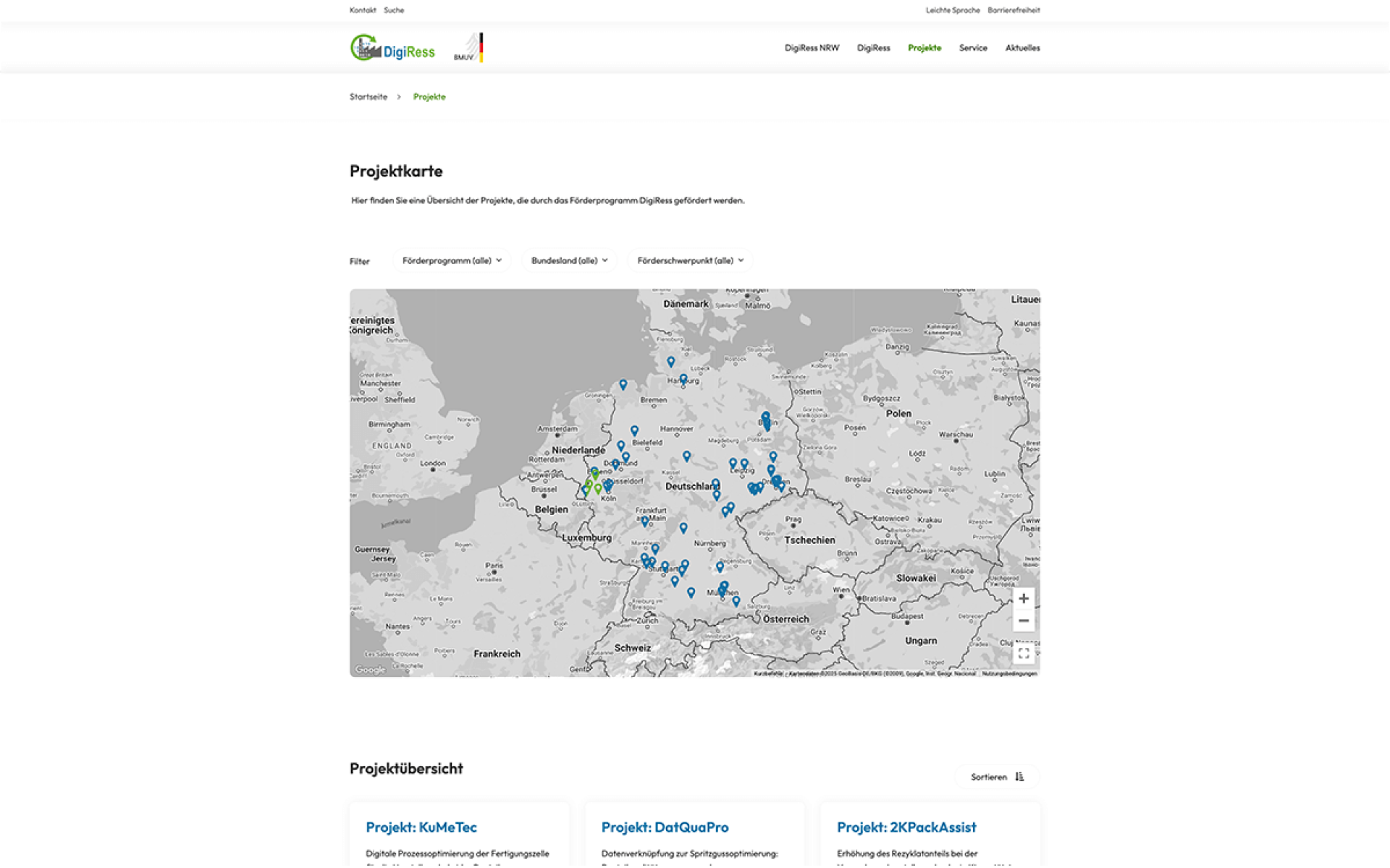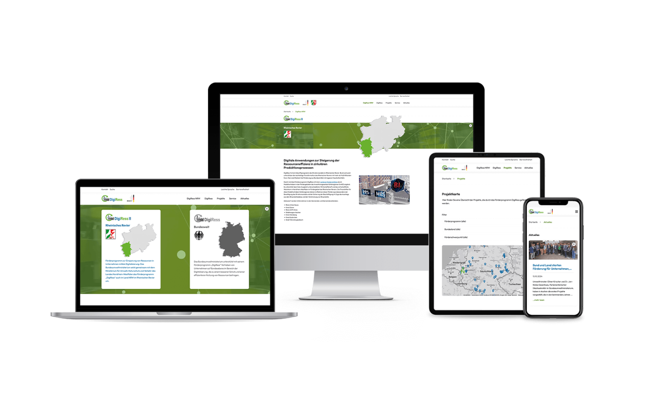 Der Fokus der neu gestalteten Website liegt auf dem aktuellen Projekt im Rheinischen Revier. Dies unterstreicht auch unser Design. In der Projektkarte sind DigiRess und DigiRess II in Grün und Blau, den Farben aus dem Logo, hinterlegt und gut zu unterscheiden.