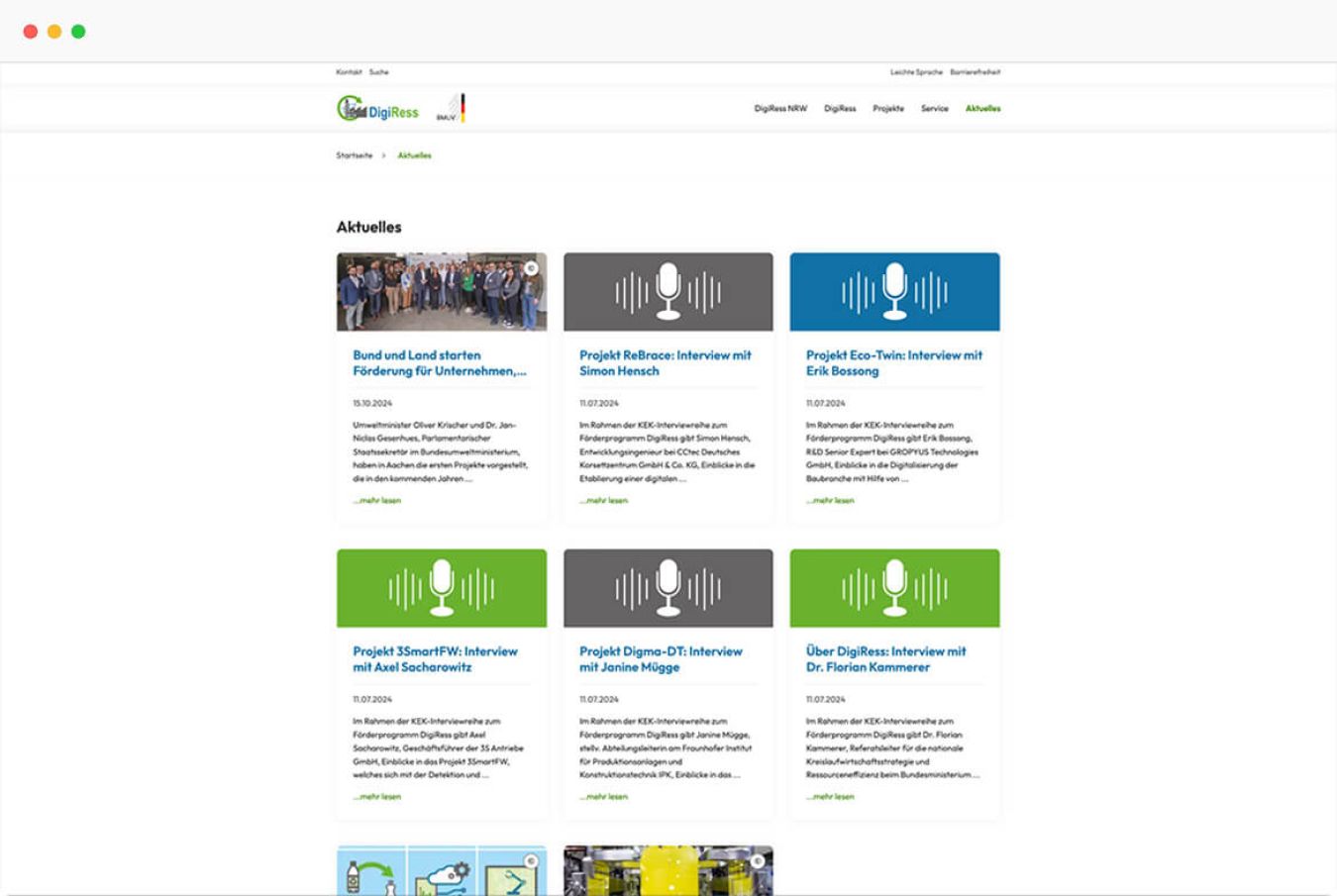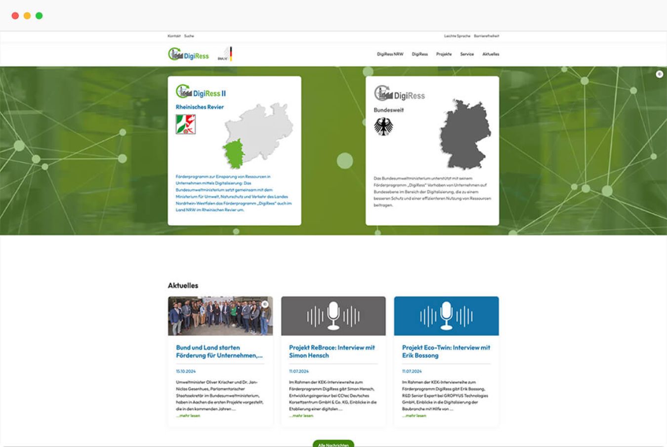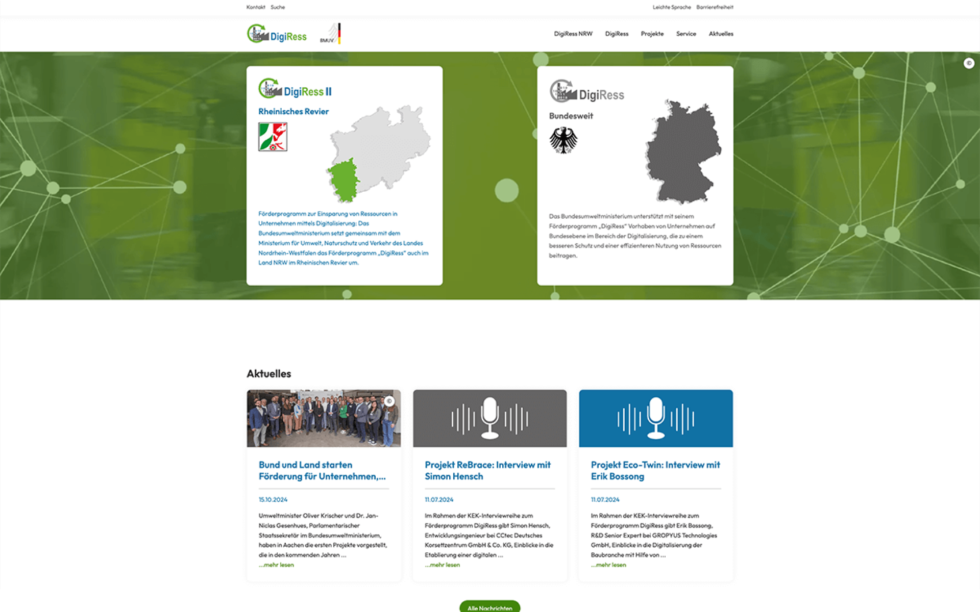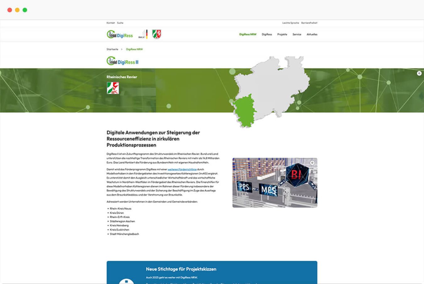 Durch die Aktualisierung und Optimierung der DigiRess-Website haben wir nicht nur die Benutzerfreundlichkeit verbessert, sondern auch sichergestellt, dass alle relevanten Informationen übersichtlich und barrierefrei zugänglich sind. So kann das Förderprogramm DigiRess II im Rheinischen Revier noch gezielter kommuniziert und effizienter genutzt werden.