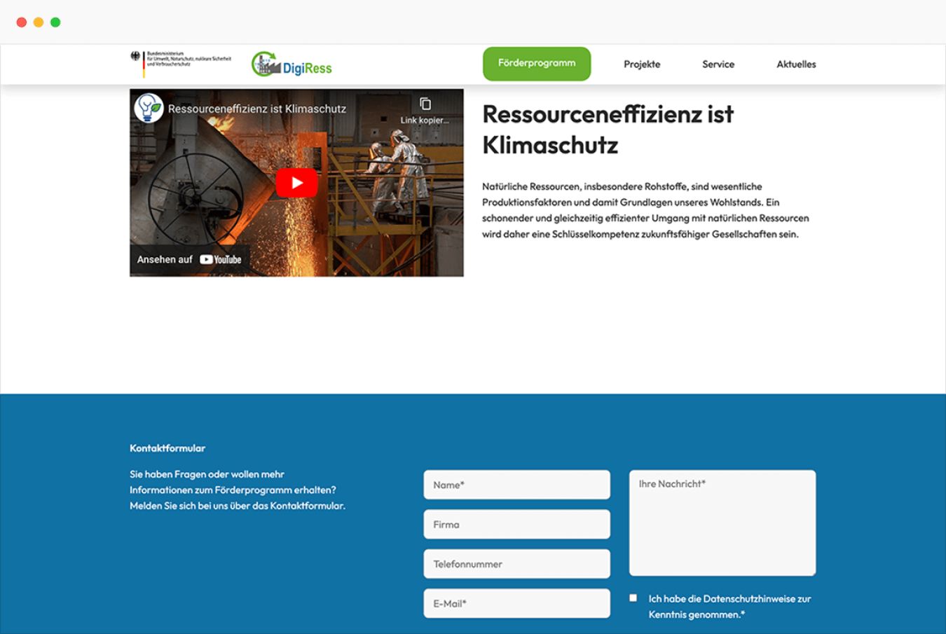 Zentrale Elemente der neuen Internetpräsenz sind der Newsbereich und der Download für Förderanträge. Im FAQ werden erste Fragen geklärt. Abgerundet wird das Informationsangebot durch einen Newsletter und die Mediathek mit Filmbeispielen von Unternehmen aus dem produzierenden Gewerbe zur effizienten Nutzung von Ressourcen.