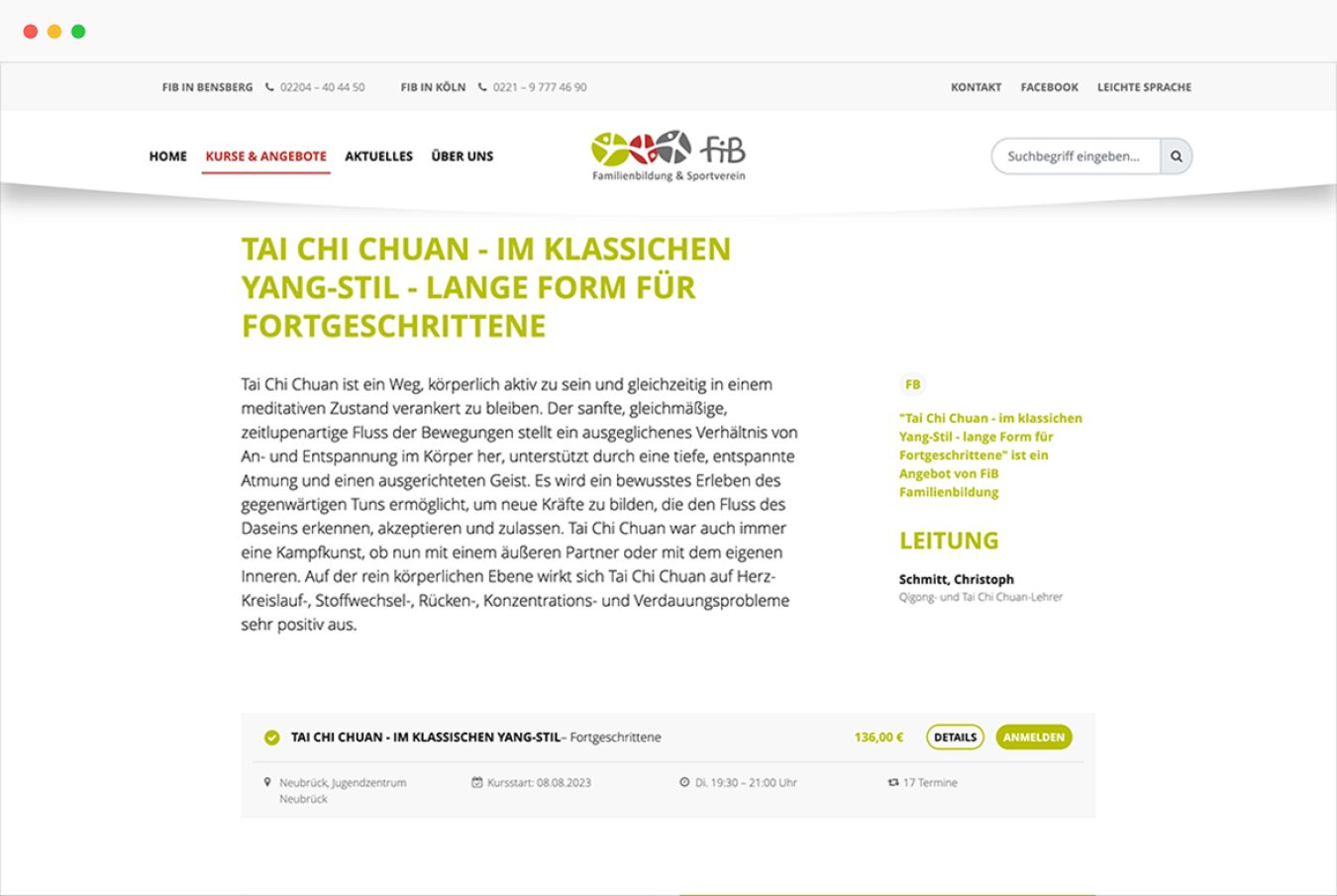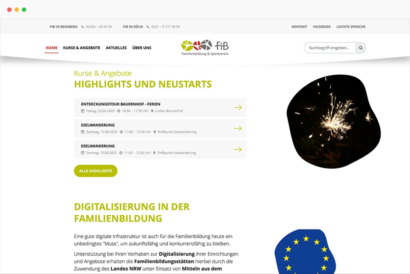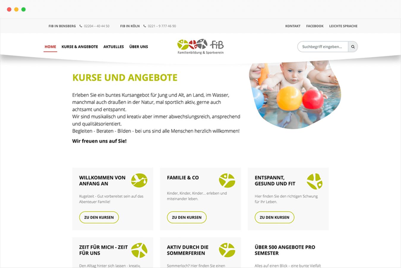 FiB e.V. ist eine Mischung aus Familienbildungsstätte und Sportverein mit Niederlassungen in Köln und Bensberg. Der Verein bietet ein vielseitiges Kursangebot rund um die Themen Fitness, Entspannung, Familie & Co an.