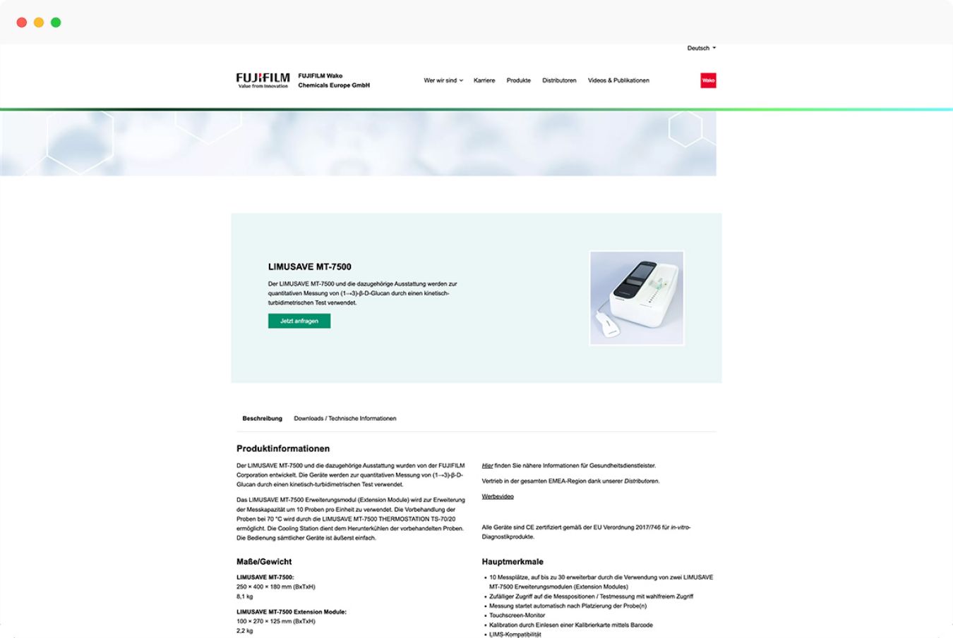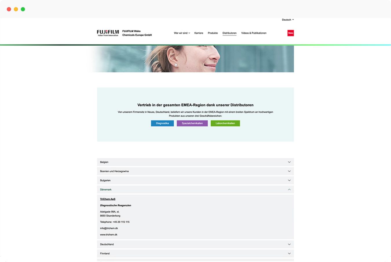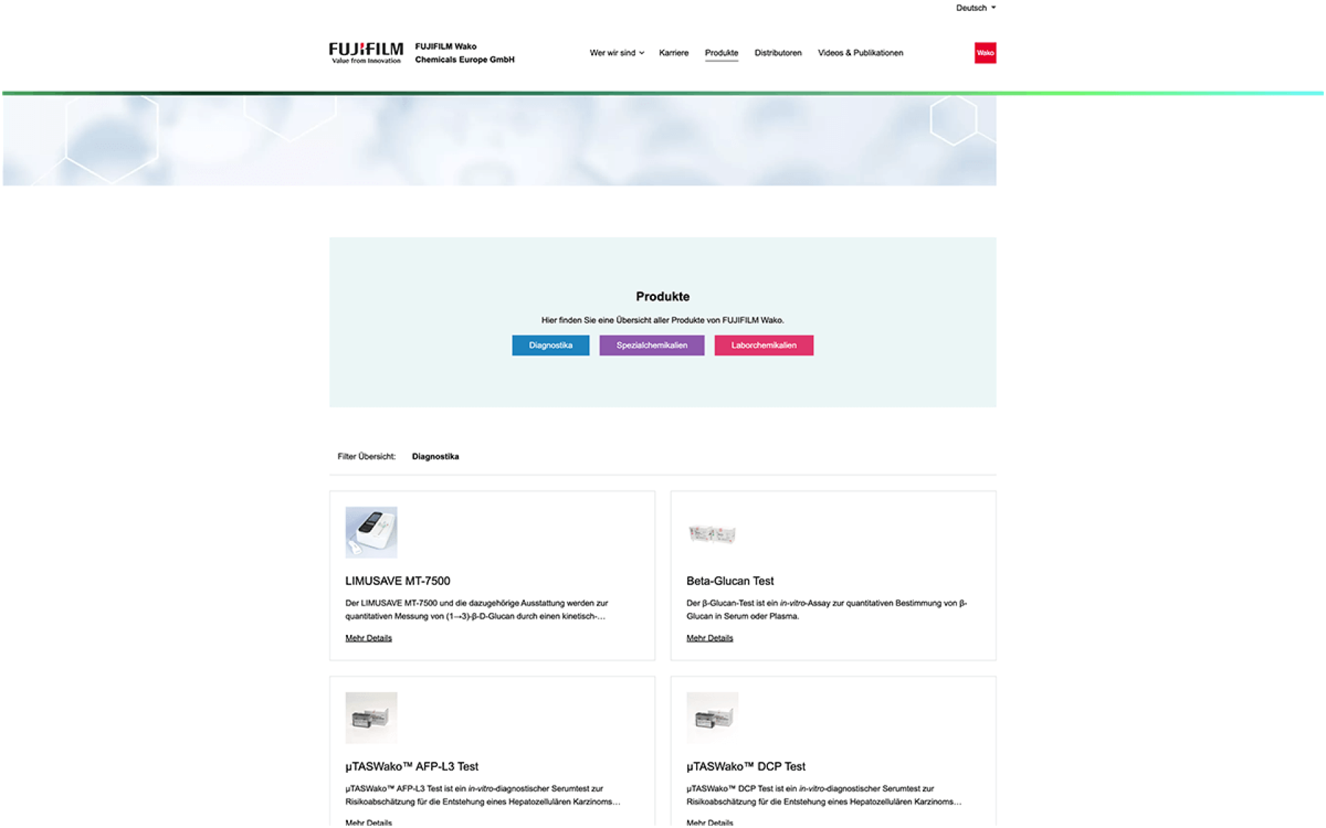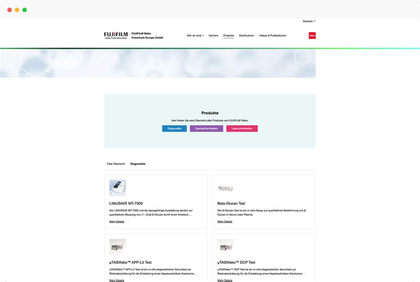 Die Produkte des Unternehmens mit Sitz in Neuss sind ebenfalls auf der Website präsent. Für die Darstellung und Anfrage der Produkte rund um Diagnostika, Spezial- und Laborchemikalien haben wir individuelle Funktionen entwickelt. Bevor die Produkte sichtbar sind, erscheint als Pop-Up Fenster eine Abfrage, ob der Interessent dem Gesundheitsbereich angehört.