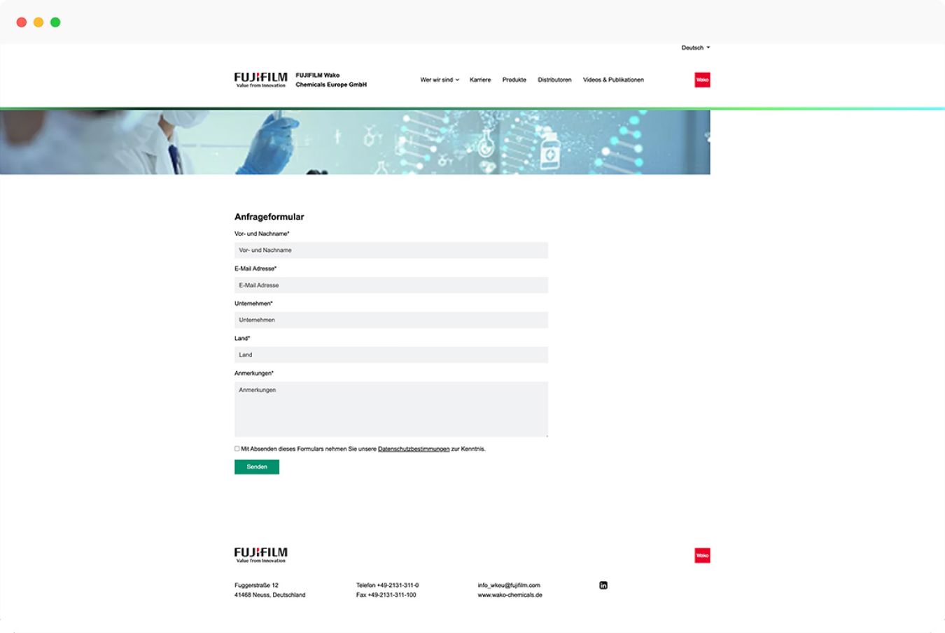 Die Unternehmensdarstellung, die im Shopware 5 Shop in der Unternavigation angelegt war, befindet sich nun an prominenter Stelle im Hauptmenü. Im Zusammenhang mit der Stärkung des Unternehmensprofils wurde auch der Bereich Karriere ausgebaut. So haben wir ein Bewerbungsformular entwickelt, bei dem Interessenten ihre Bewerbungsunterlagen direkt hochladen und unkompliziert Kontakt zu FUJIFILM aufnehmen können.