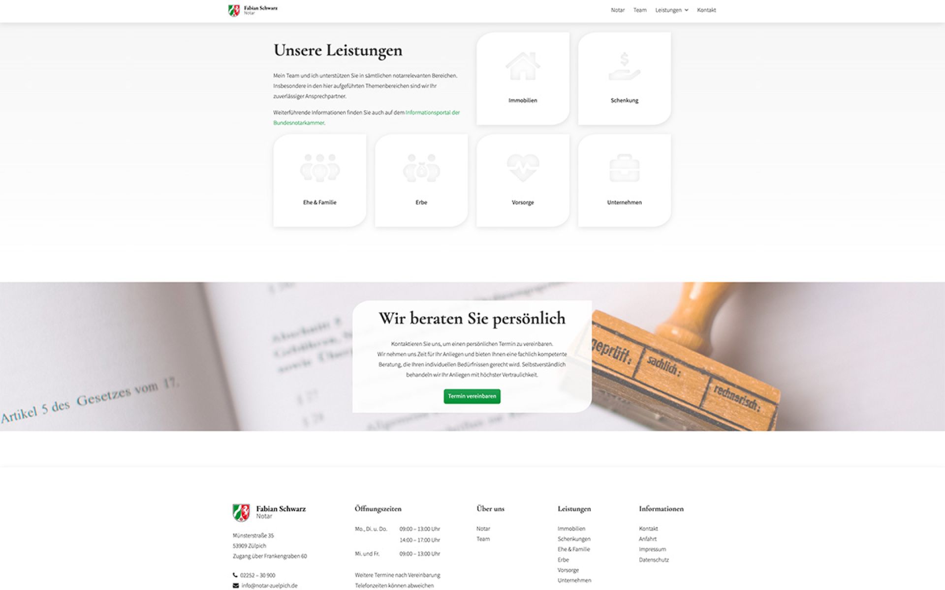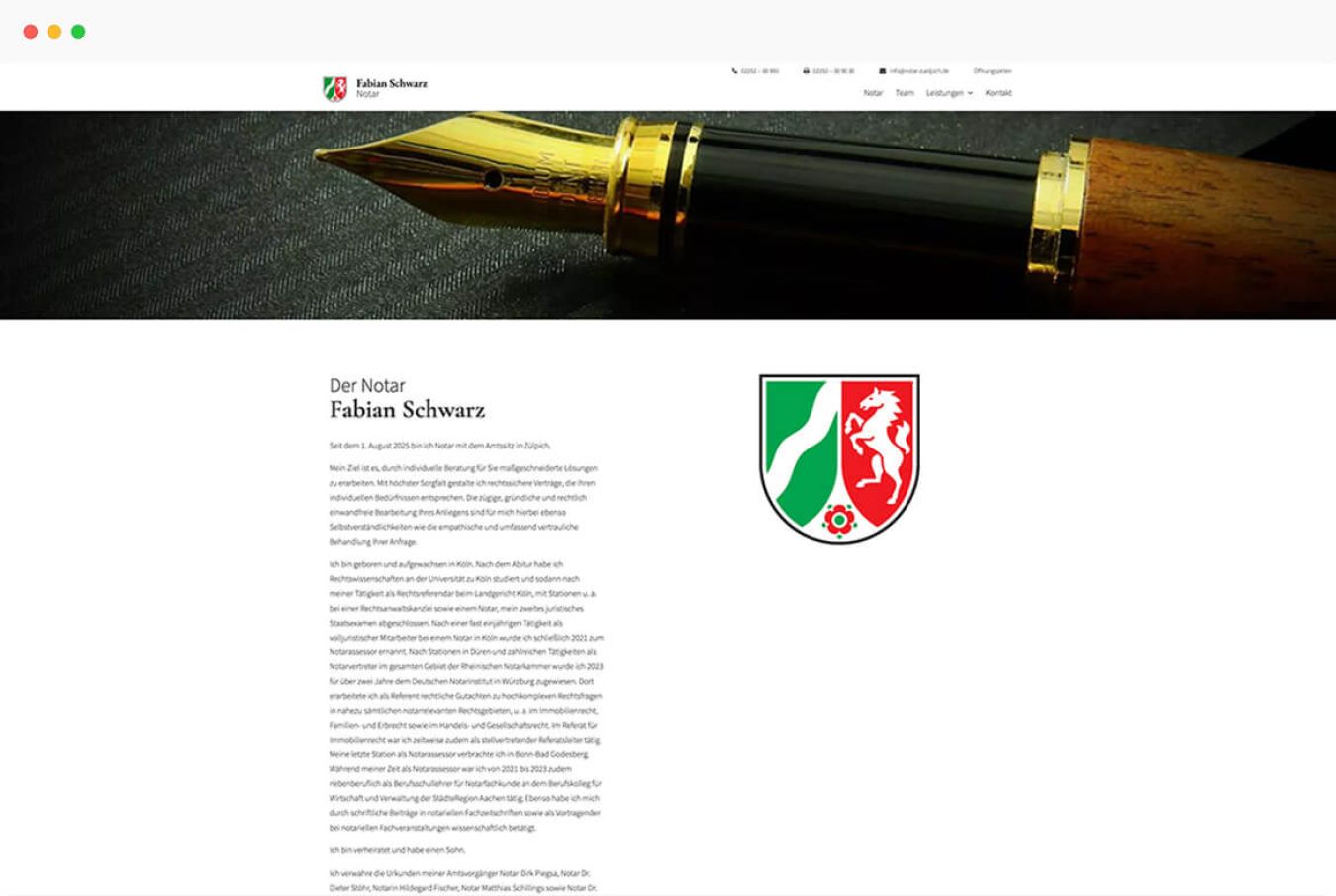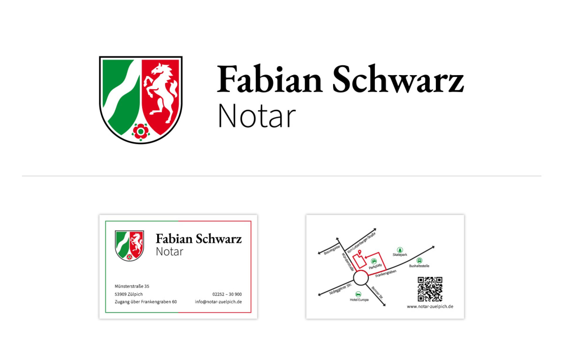 Wir haben für Notar Schwarz das Logo und die Visitenkarte als wesentliche Bestandteile der Geschäftsausstattung entwickelt und ihn bei der Erstellung eines Google Unternehmensprofils unterstützt. Darüber hinaus haben wir den Internetauftritt konzipiert und umgesetzt. Die Website stellt in modernem Design und übersichtlicher Struktur die Leistungen des Notariats vor.