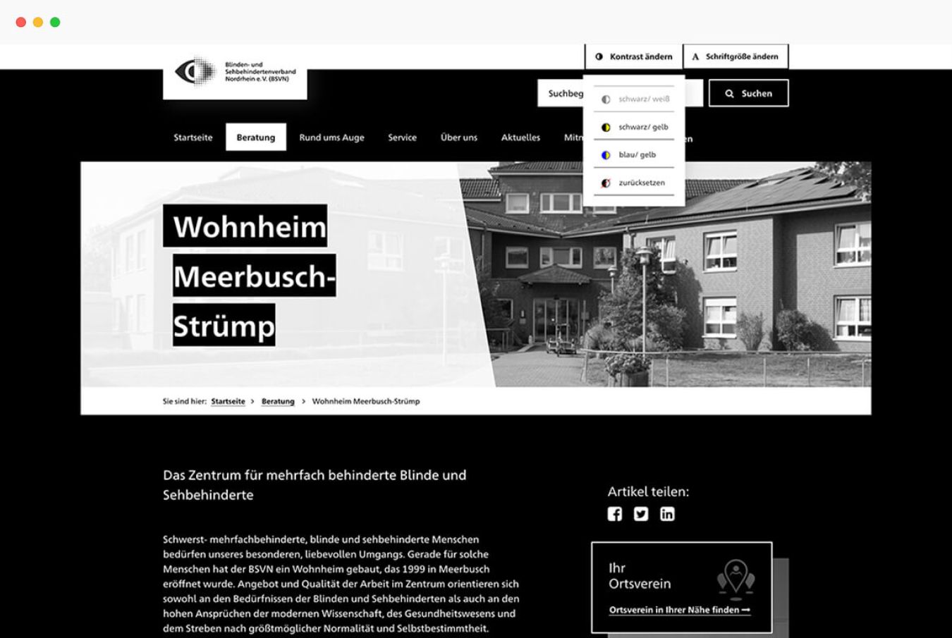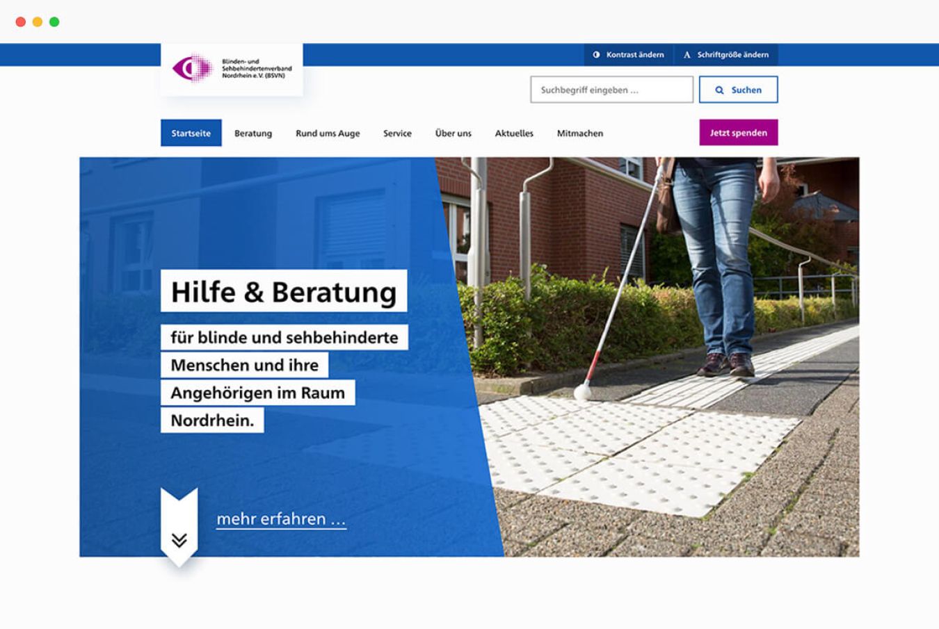 Beim Relaunch der Website standen die Bedürfnisse der sehbehinderten Zielgruppe im Vordergrund: Der neue Internetauftritt ist barrierefrei, die Kontraste können verändert, die Schrift vergrößert und die Inhalte auf Leichte Sprache umgestellt werden. Die Website ist Teil einer Multidomainlösung: Ihr Content wird über das CMS webEdition zentral gepflegt, in dem auch die Inhalte der Website des Blinden- und Sehbehinderten-Zentrum Nordrhein (BSZN) verwaltet wird. Der regelmäßige Versand von Newslettern erfolgt zukünftig ebenfalls direkt aus webEdition über das integrierte Newsletter-Modul.