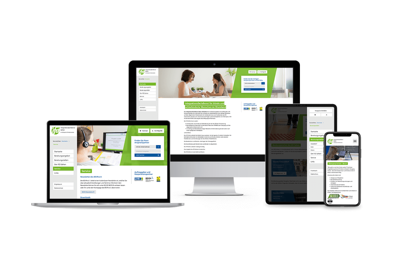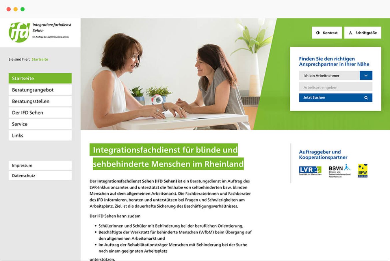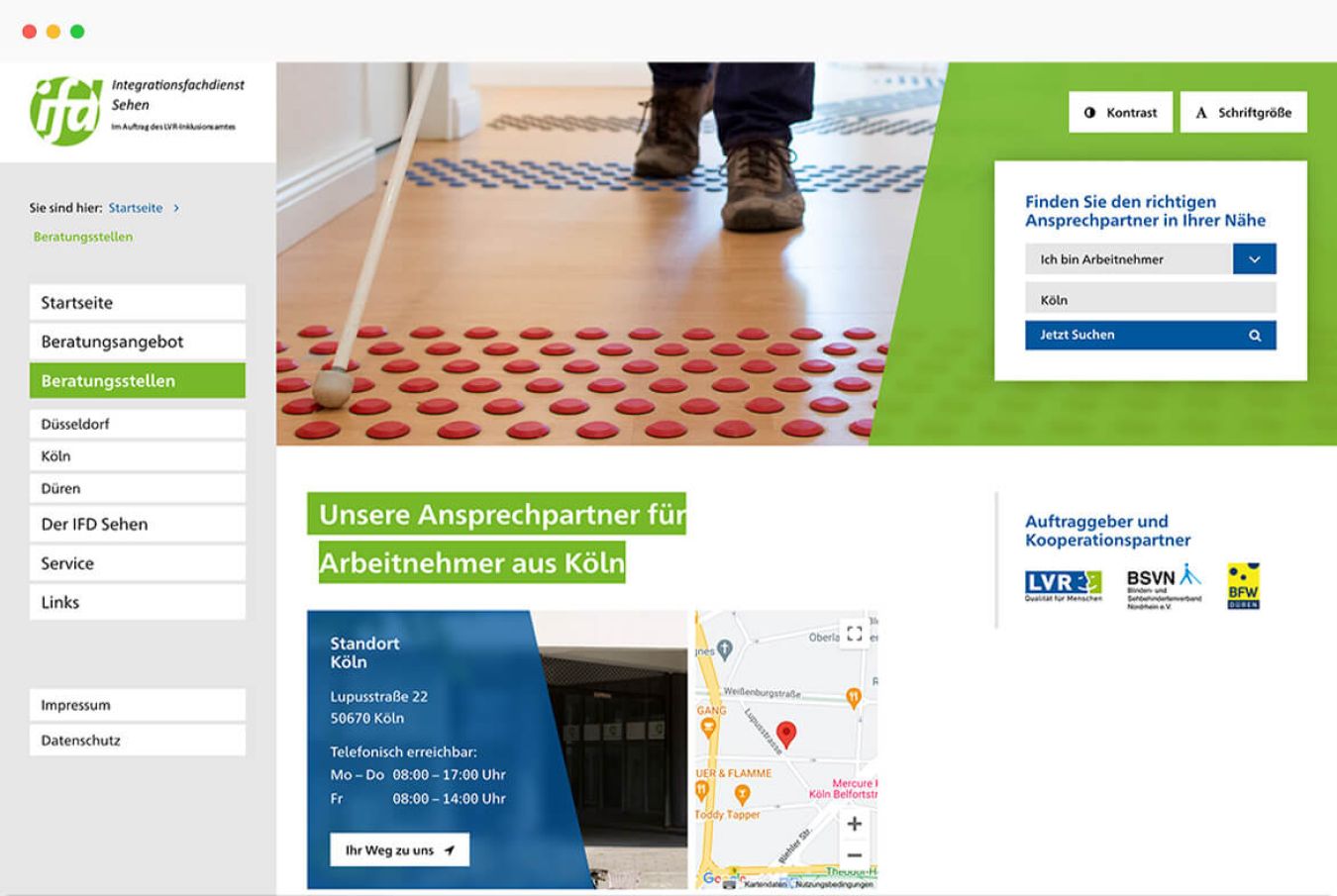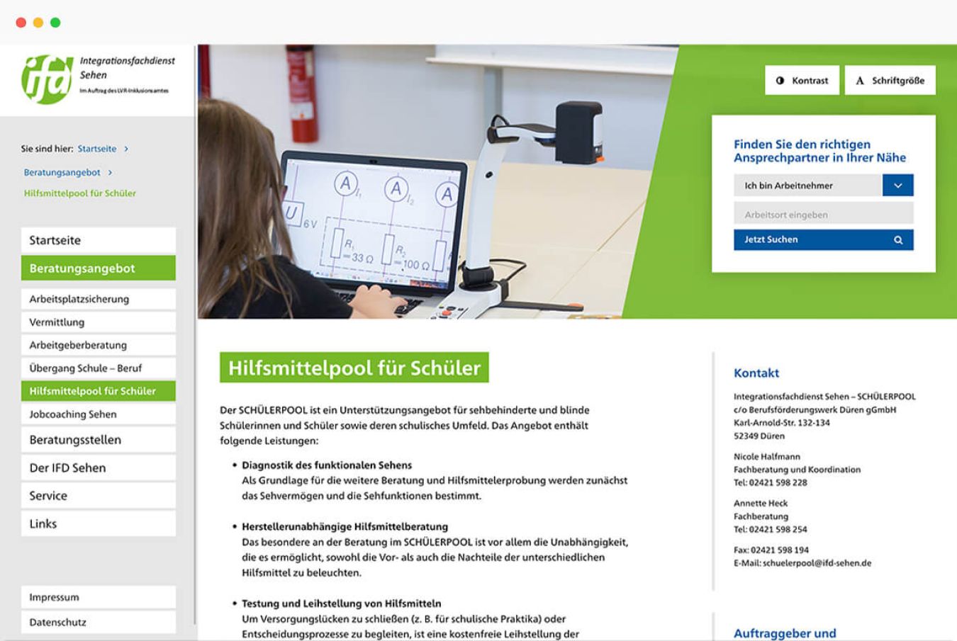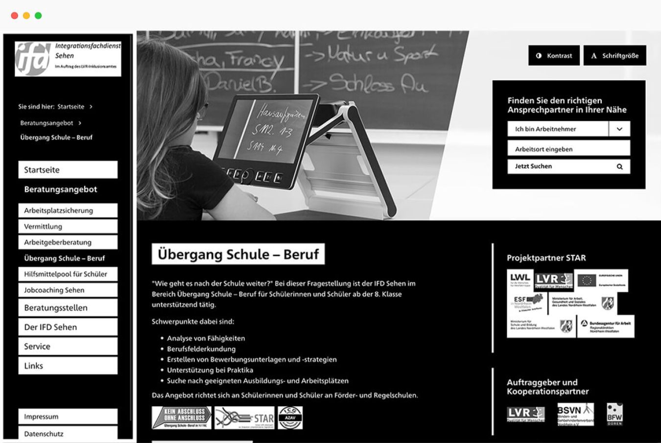Wir haben Gestaltung und Benutzerführung der Website auf die Bedürfnisse der Zielgruppe zugeschnitten. Der Internetauftritt ist barrierefrei, Kontrast und Schriftgröße kann man variabel einstellen. Wir haben eine Ansprechpartnersuche programmiert, über die man nach ausgewählten Kriterien den zuständigen Berater vor Ort findet. Eine Wegbeschreibung speziell für Blinde erleichtert die Kontaktaufnahme.